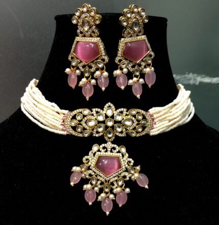 Traditional Kundan Choker Necklace Set for Women | Pink Stone Pearl Bridal Jewellery Set