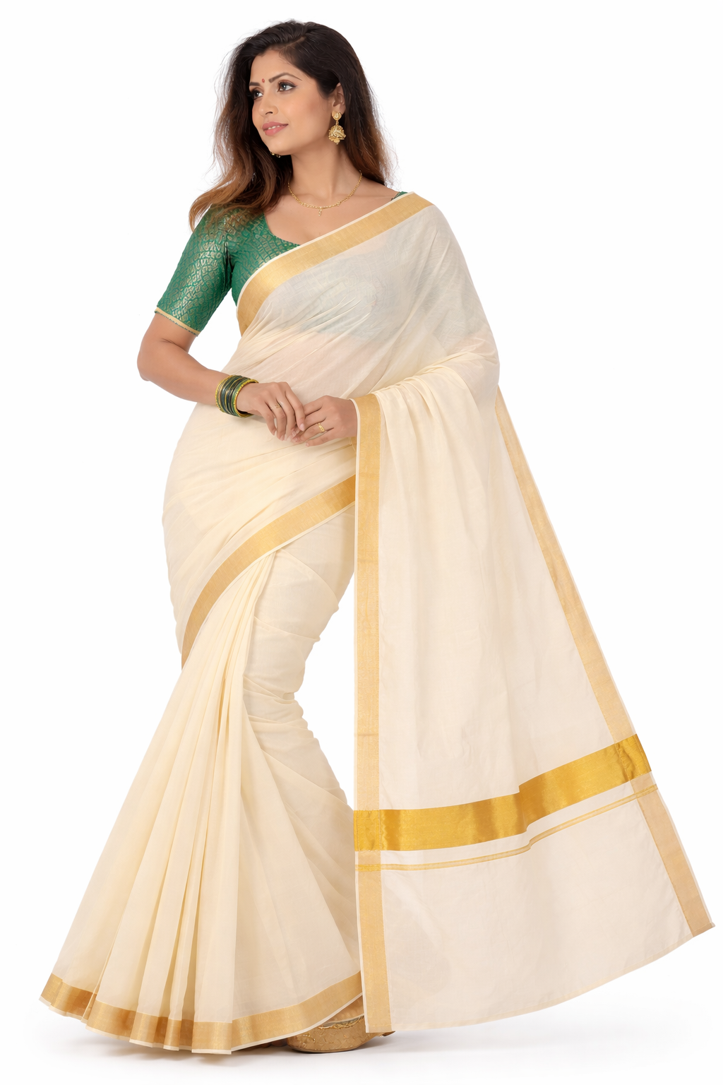 Pair it with gold or green jewelry and a matching blouse to achieve a classic Kanjivaram-inspired ethnic look.