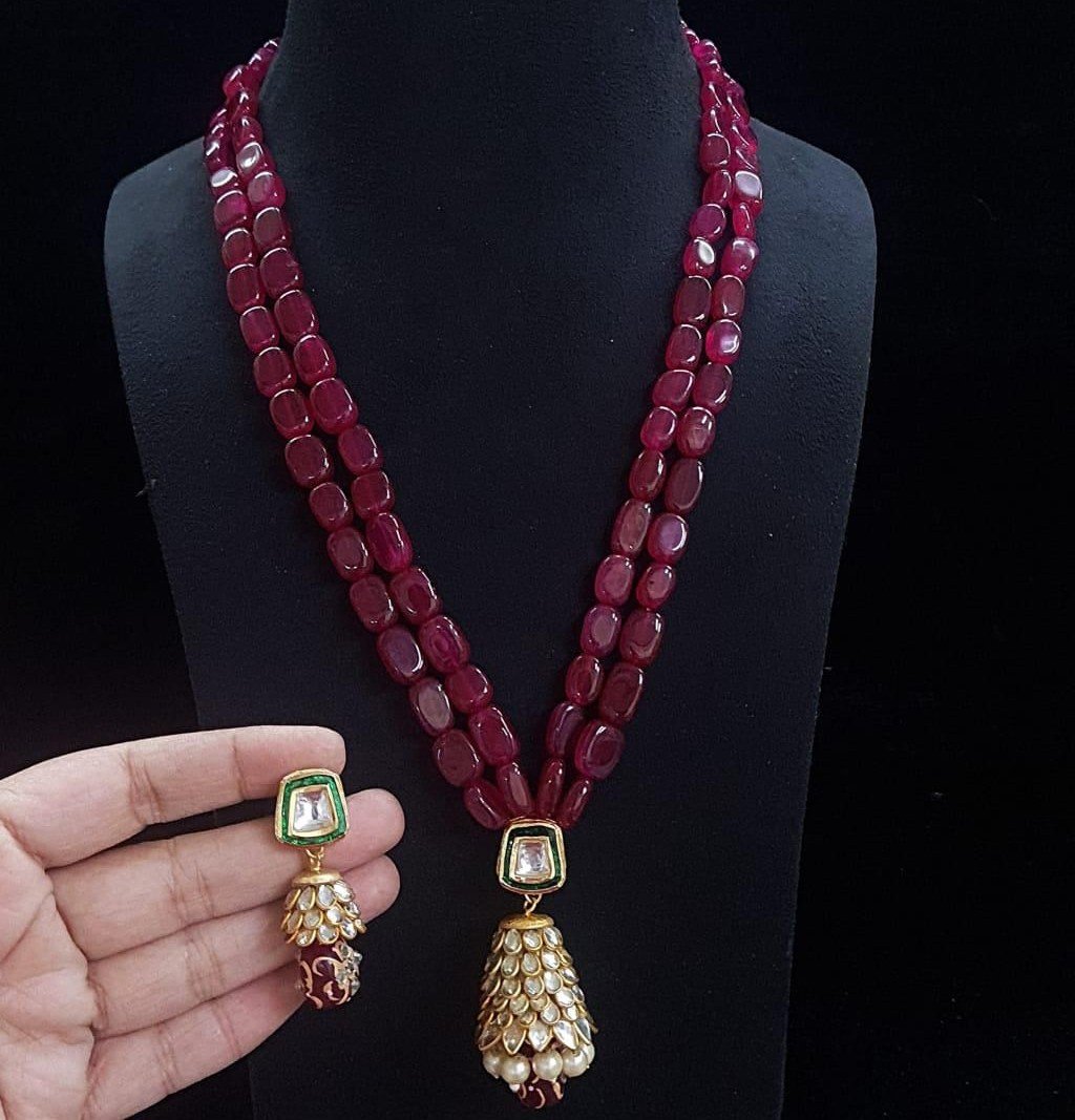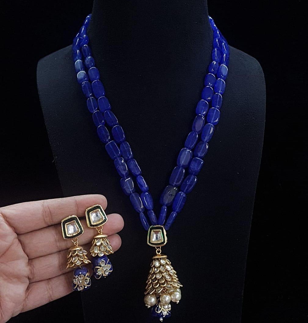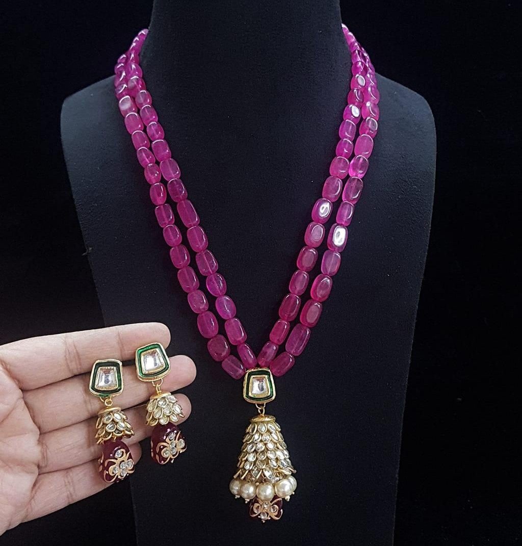 Enhance your look with this elegant beaded necklace set for women, designed with premium quality beads and a beautiful traditional pendant. The necklace features a double-layer bead design with a stylish stone pendant and matching earrings, giving it a rich and classy appearance.