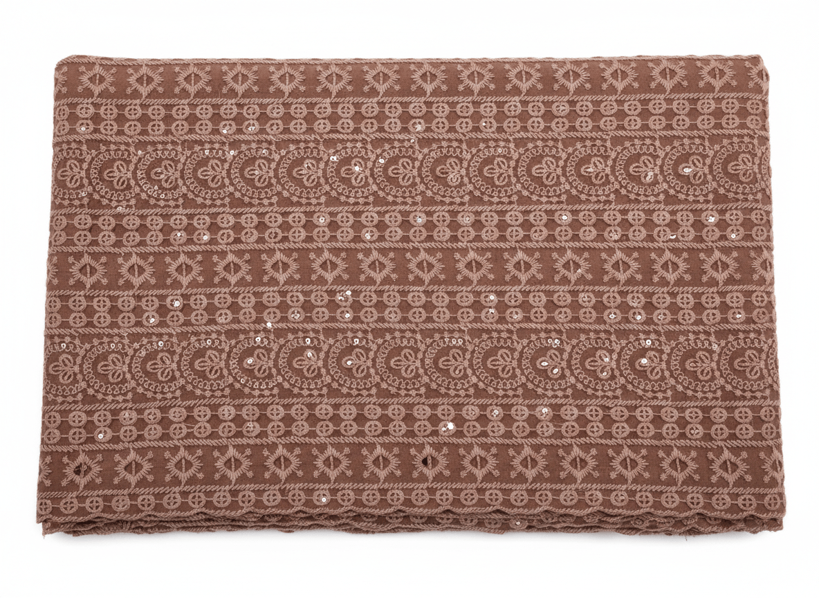 The suit set includes embroidered kurta fabric, matching bottom fabric, and a coordinating dupatta that completes the traditional look. The elegant brown color with detailed embroidery creates a sophisticated and graceful appearance suitable for festive occasions and celebrations.