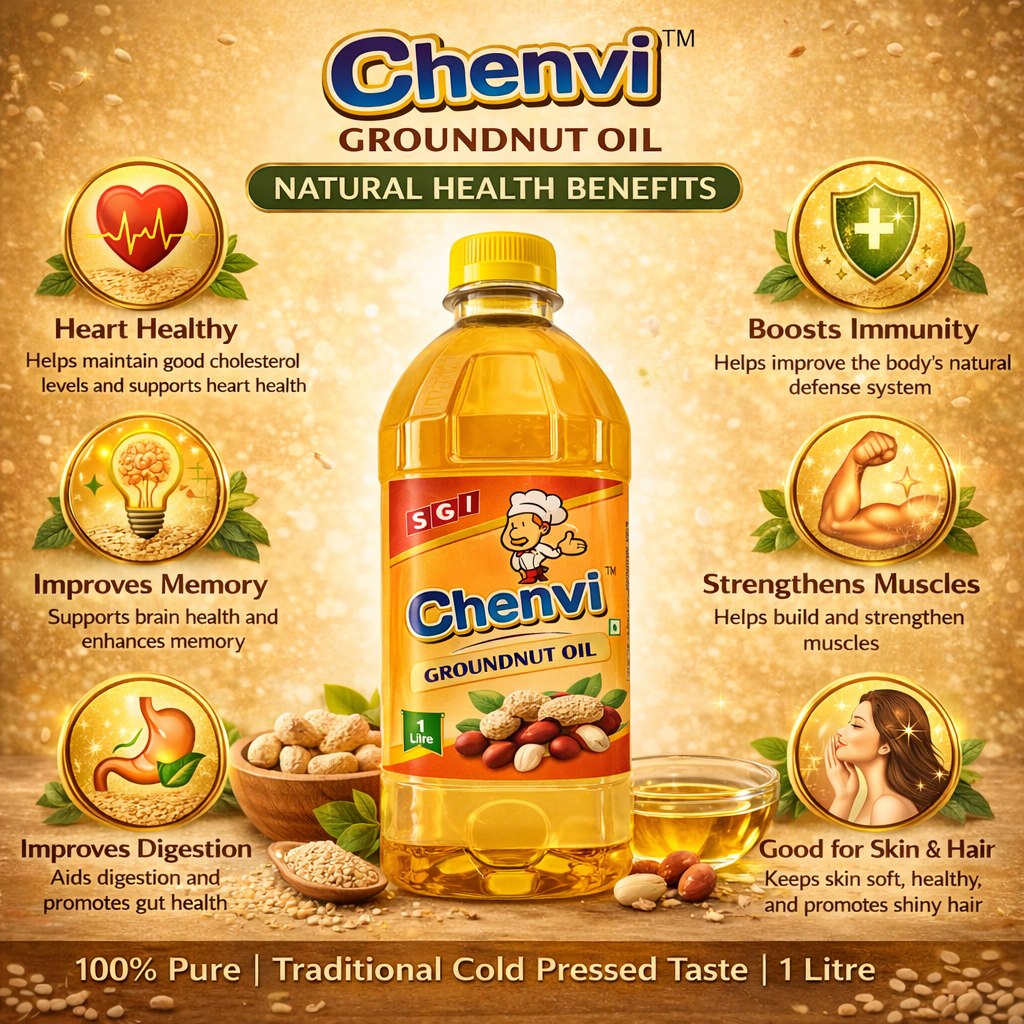 Groundnut oil is known for its natural aroma and balanced nutrition, making it a great choice for everyday cooking. Chenvi ensures hygienic processing and packaging to maintain freshness and quality.