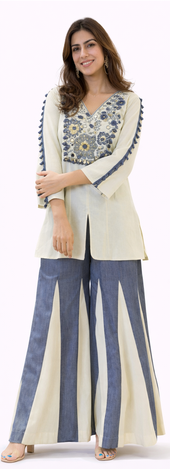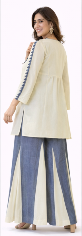 Cream & Blue Embroidered Kurta Palazzo Set for Women | Designer Ethnic Wear