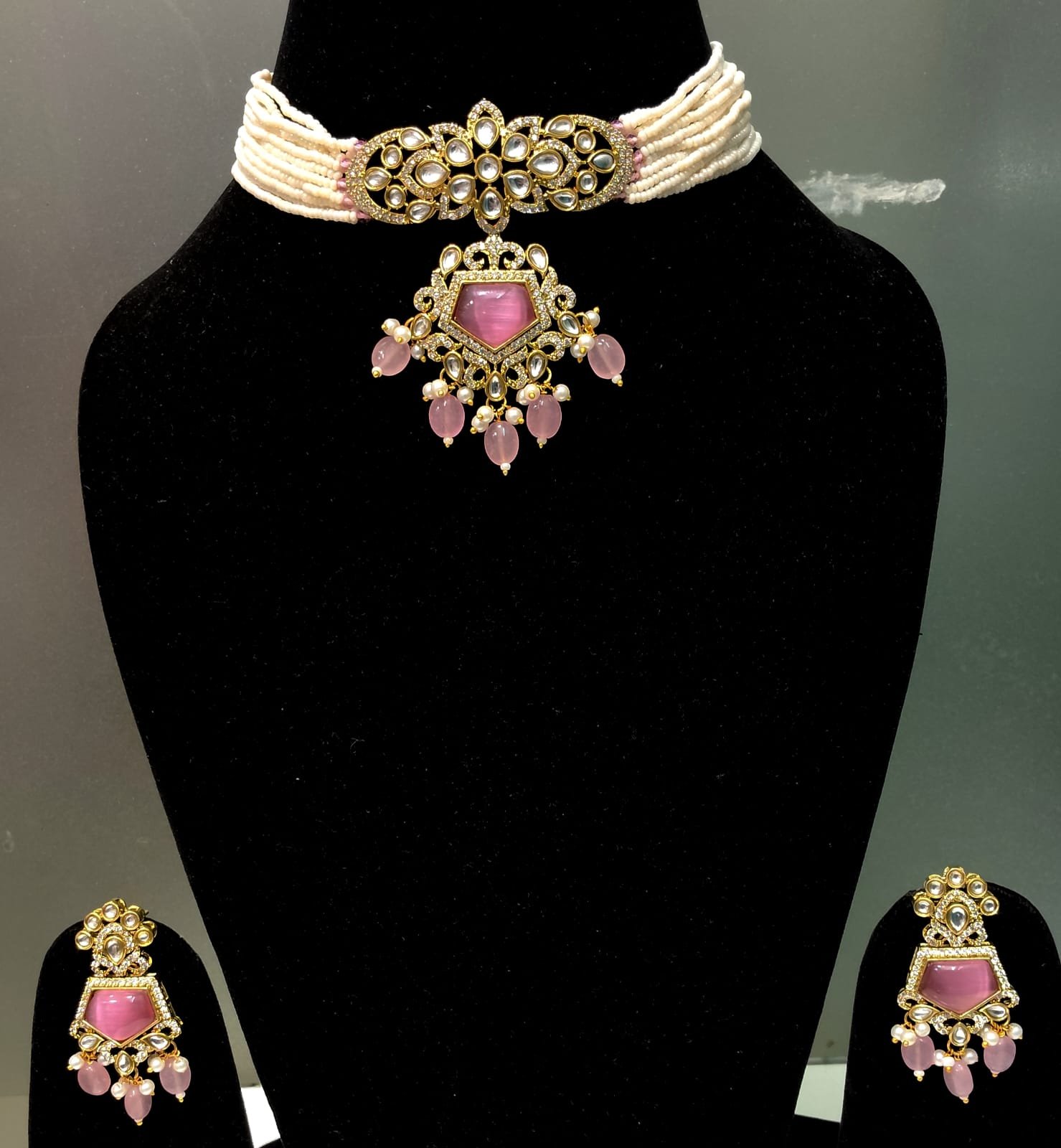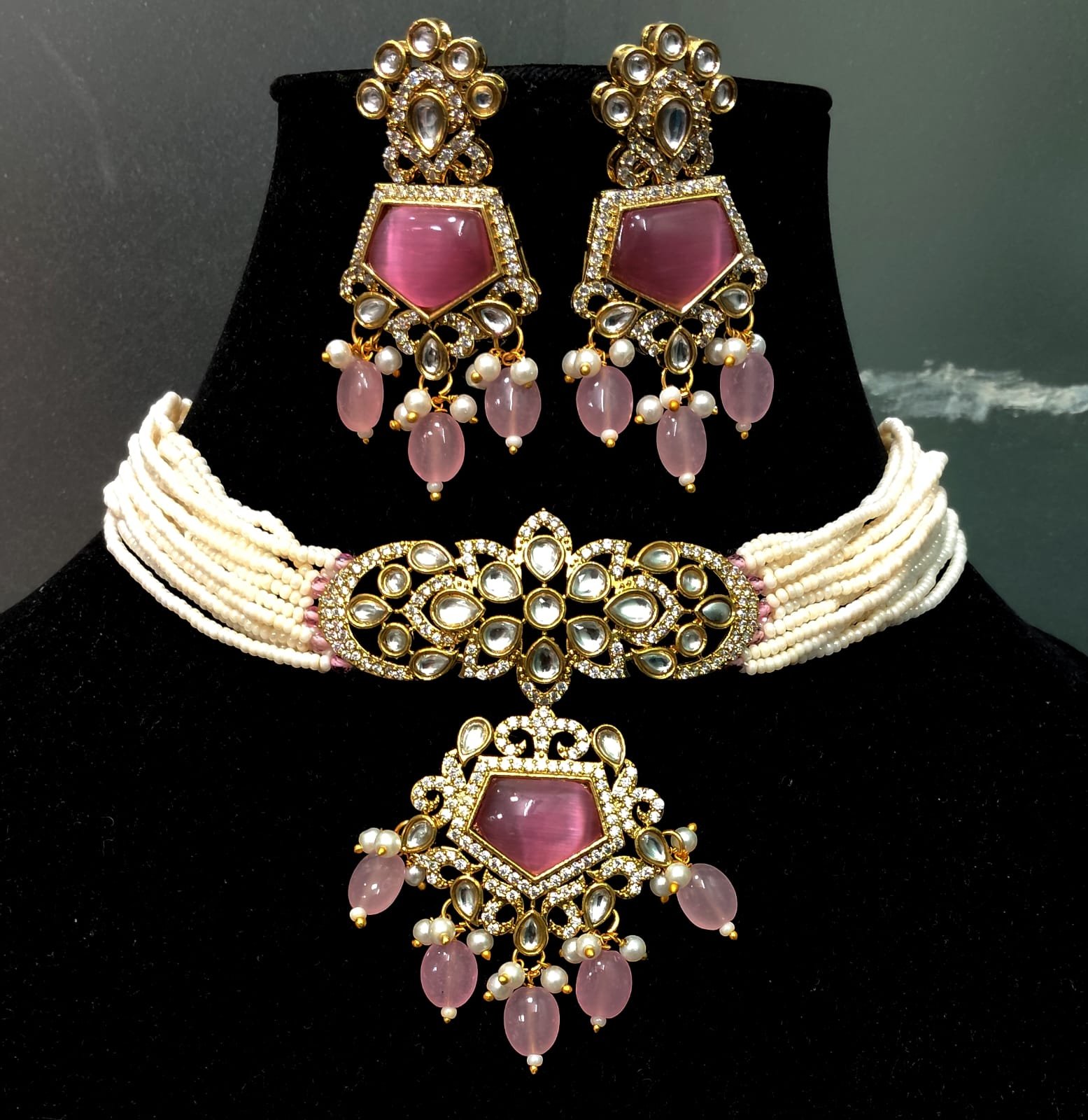 Traditional Kundan Choker Necklace Set for Women | Pink Stone Pearl Bridal Jewellery Set