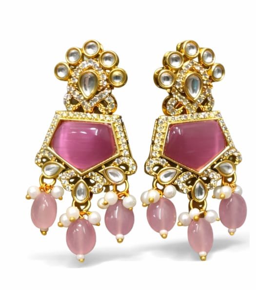 The centerpiece pendant and matching earrings are crafted with detailed stone setting and hanging bead drops, making it perfect for weddings, festive occasions, and bridal wear. Lightweight yet premium in appearance, this set ensures comfort without compromising on style.