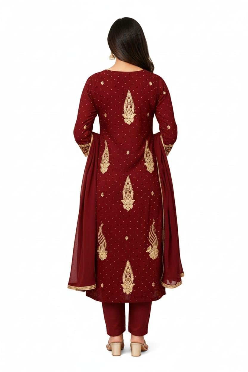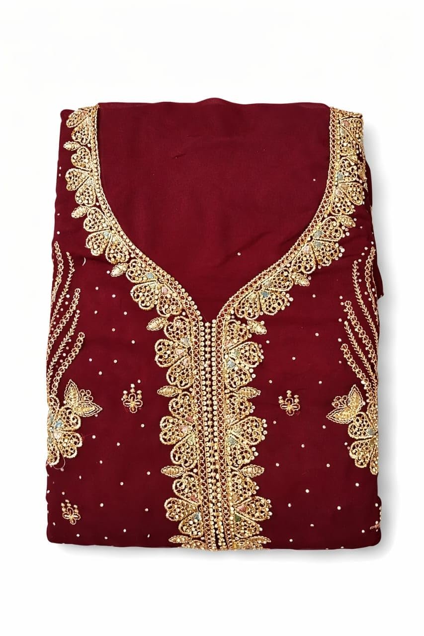 Women Maroon Embroidered Kurta Set with Golden Zari Work – Straight Cut Ethnic Wear with Matching Pants (Unstitched)
