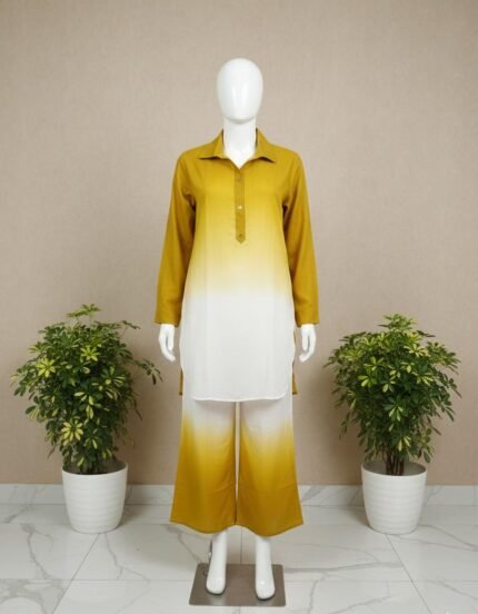 Buy stylish mustard yellow ombre kurta set with palazzo pants for women. Perfect for daily wear, office, and casual occasions. Comfortable, trendy & affordable ethnic wear.