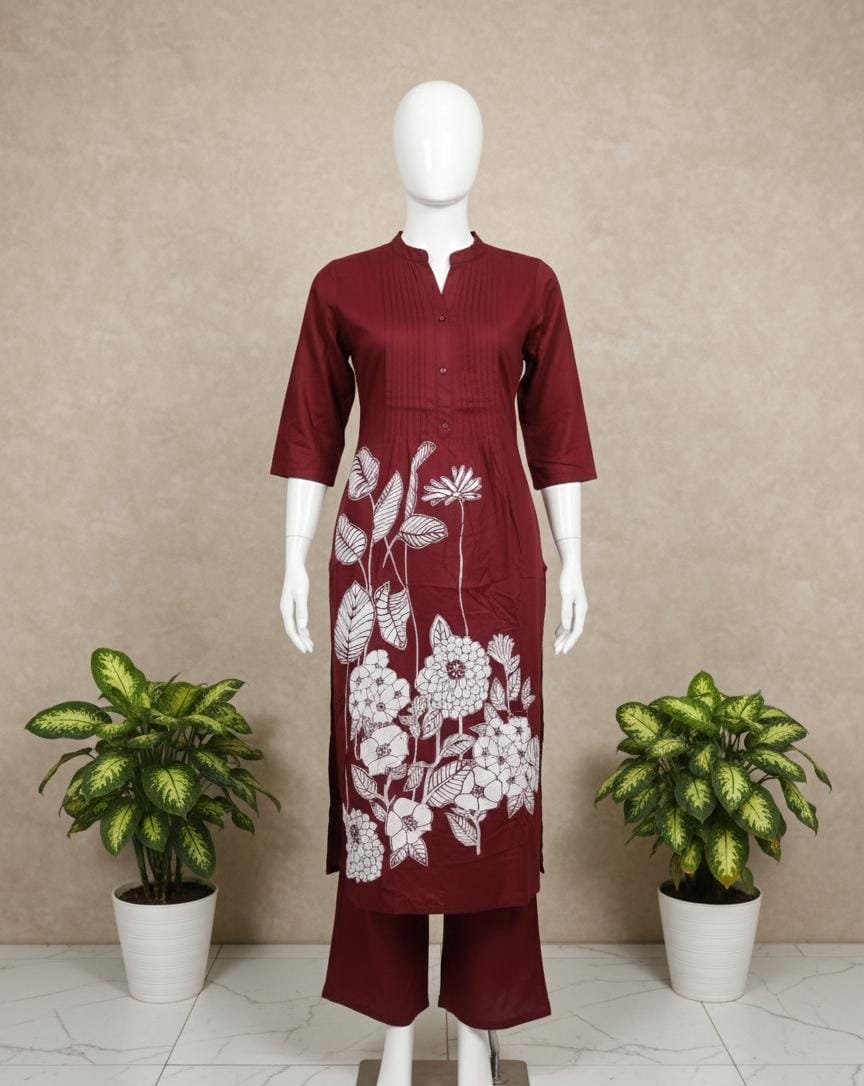 Women Maroon Floral Printed Cord Set with Palazzo Pants – Stylish Ethnic Kurta Set for Daily & Office Wear
