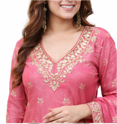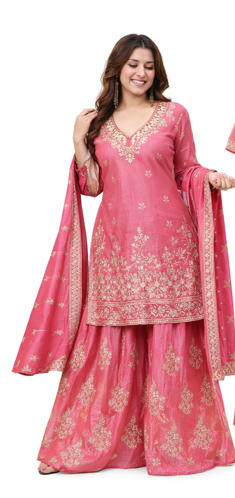 Upgrade your ethnic wardrobe with this stunning pink embroidered kurta sharara set designed for modern women who love traditional elegance. This outfit features a beautifully crafted kurta with intricate golden embroidery paired with a flared sharara and a matching dupatta.
