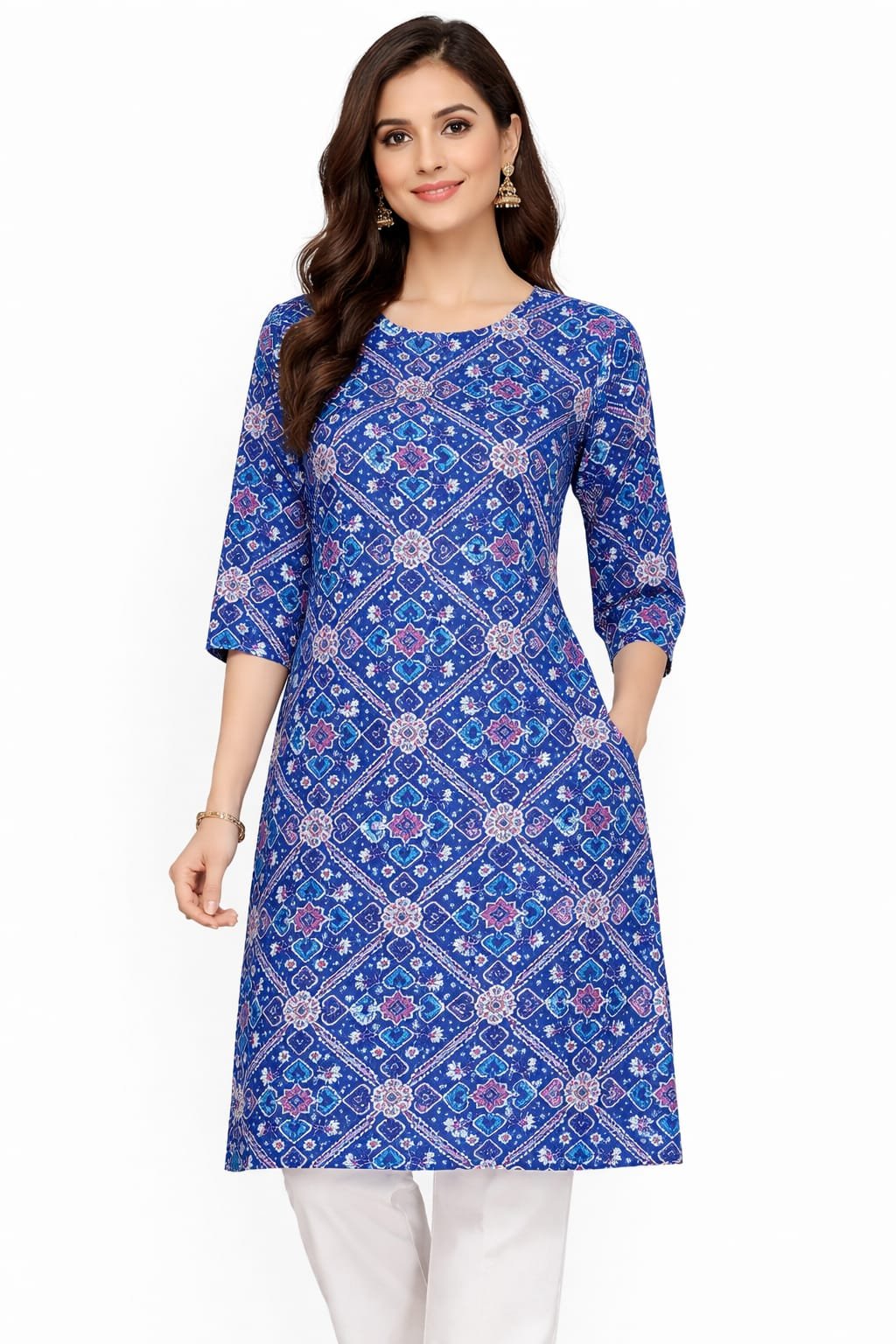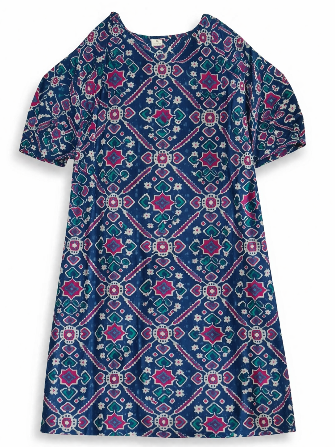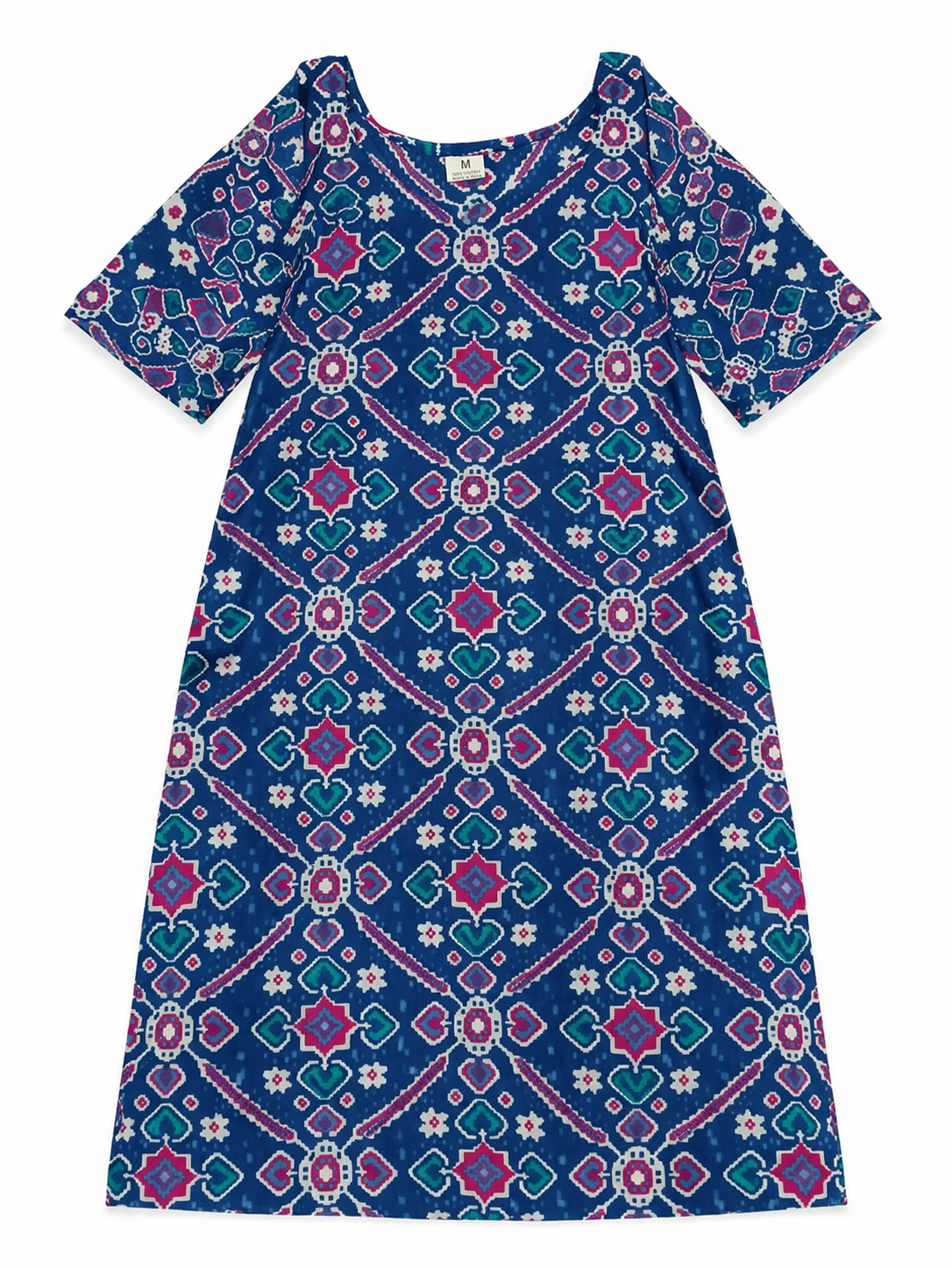 Featuring a classic Patola print, this top blends traditional charm with modern styling. The knee-length design and 3/4 sleeves make it ideal for casual outings, office wear, or daily use.