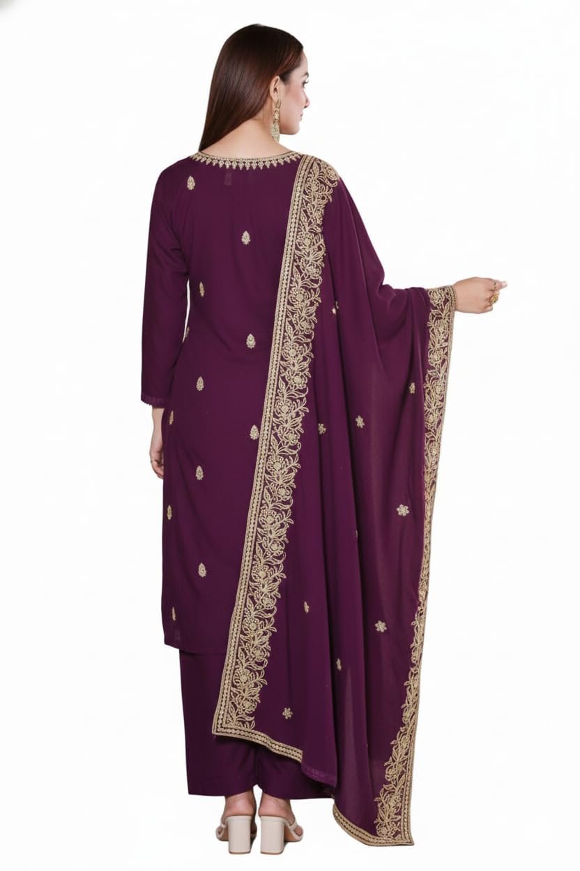 The suit set includes a beautifully embroidered kurta fabric, matching bottom fabric, and a coordinating dupatta that enhances the overall ethnic look. The rich purple colour combined with gold embroidery creates a luxurious and festive appearance.