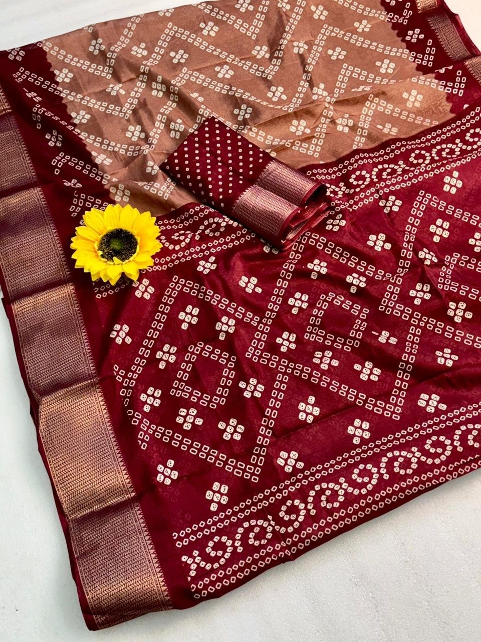 Upgrade your ethnic wardrobe with this stunning Super Bandhani Ajrakh Gold saree, designed with elegant floral prints and rich zari detailing. Crafted from premium marsh mellow fabric, this saree offers a soft feel with a luxurious look.