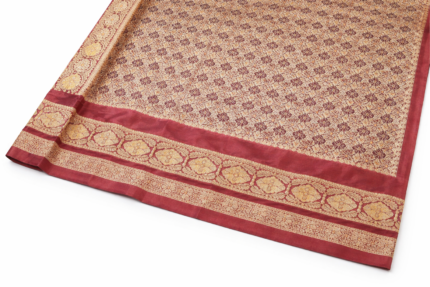 Add classic charm to your ethnic wardrobe with this beautifully crafted antique gold tassel saree. The saree features a soft antique gold (ochre-toned) base with intricate woven patterns that give it a rich and elegant appearance. The deep maroon zari border adds a striking contrast, enhancing its traditional appeal.