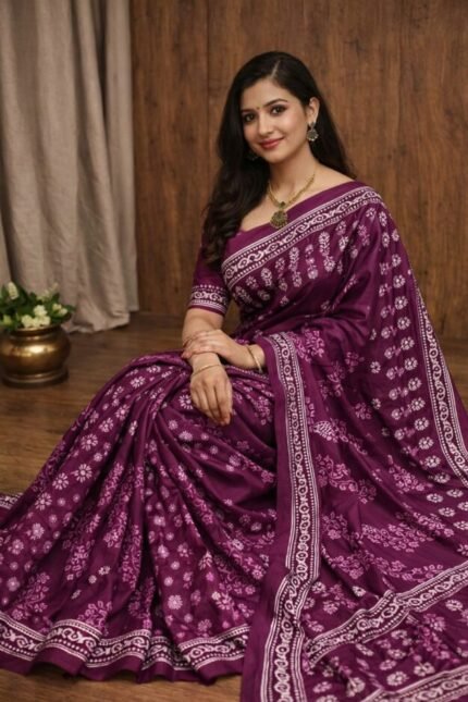 Style it with antique gold or maroon jewelry and a matching blouse to complete a sophisticated ethnic ensemble.