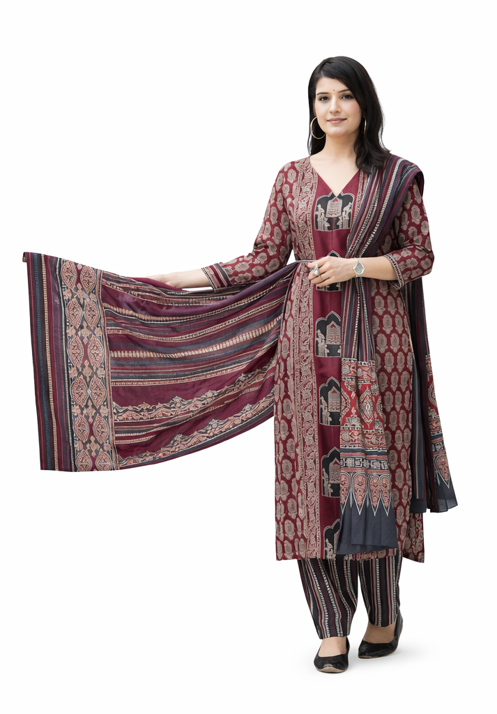 Enhance your ethnic wardrobe with this beautiful maroon printed kurta set paired with a matching dupatta. Designed with intricate traditional patterns, this outfit offers a graceful and elegant look. Made from comfortable fabric, it is perfect for festive occasions, casual outings, and daily ethnic wear.