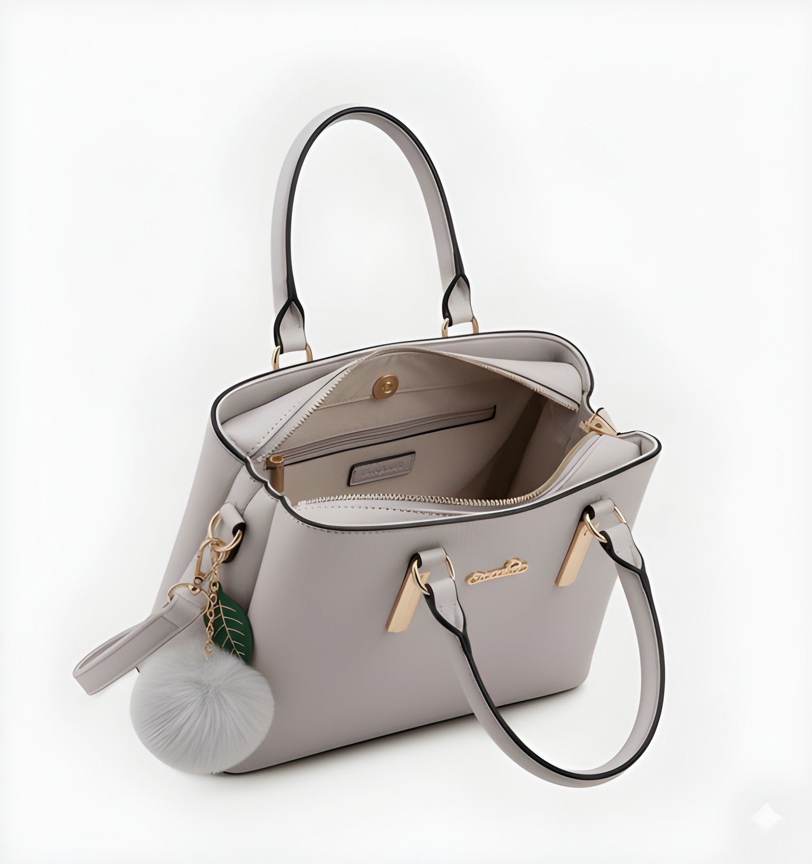 Premium Women’s PU Leather Handbag | Stylish Shoulder & Tote Bag with Fur Charm| Light Grey