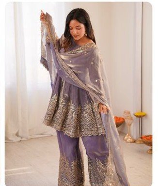Women’s Lavender Grey Embroidered Kurta Palazzo Dupatta Set | Festive Ethnic Wear