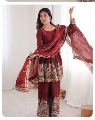 Step into elegance with this stunning women’s Anarkali gown, designed with a rich and graceful flair. Crafted in a beautiful wine red shade, this gown features delicate embroidery all over with a heavily embroidered border that adds a royal touch.