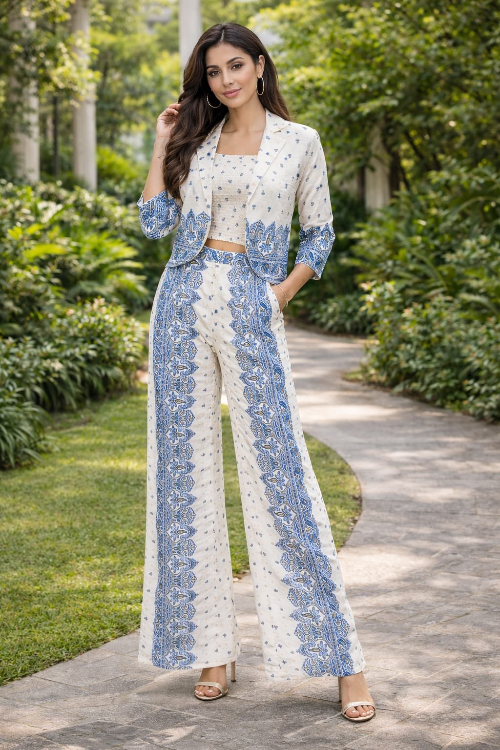 Upgrade your fashion game with this elegant women’s white and blue printed co-ord set with jacket, designed for a modern and stylish look. Featuring a trendy crop top paired with a lightweight jacket and wide-leg pants, this outfit blends comfort with contemporary fashion.