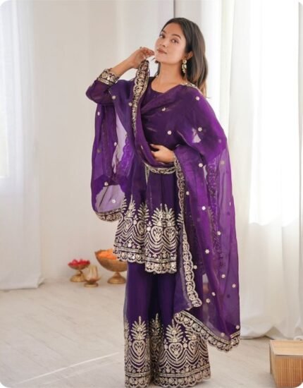Women’s Purple Embroidered Kurta Palazzo Set with Dupatta | Ethnic Party Wear Suit Set