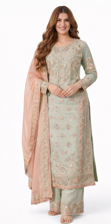 Women Pastel Green Embroidered Kurta Set with Dupatta | Designer Party Wear Ethnic Suit | Wedding & Festive Wear